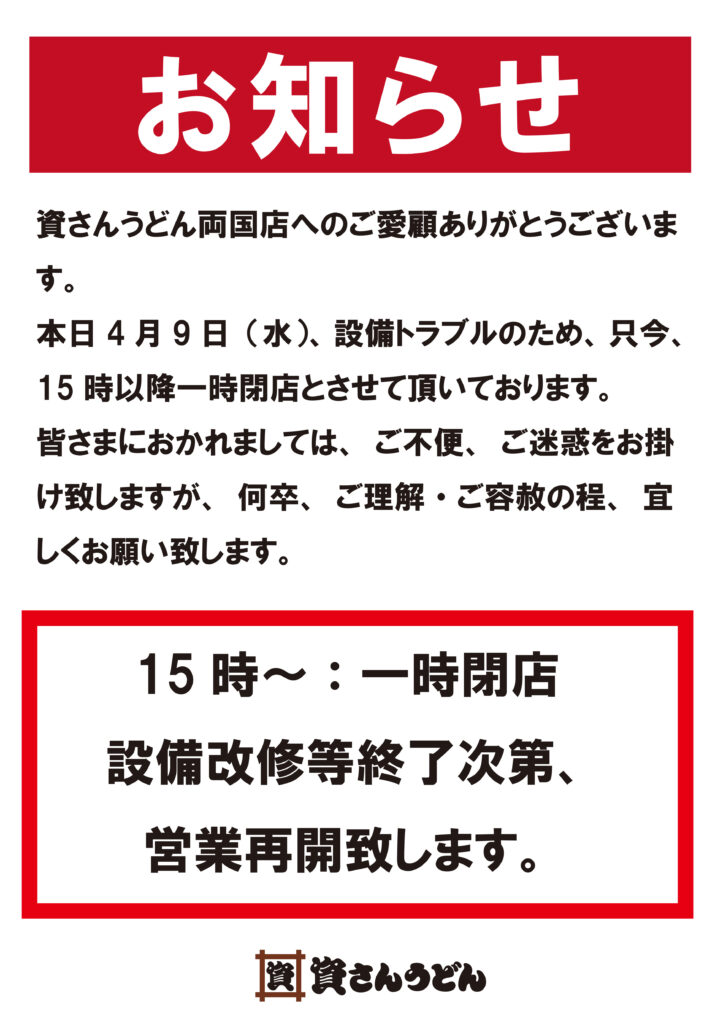 本日4 月9 日(水)、設備トラブルのため、只今、15 時以降一時閉店とさせて頂いております。