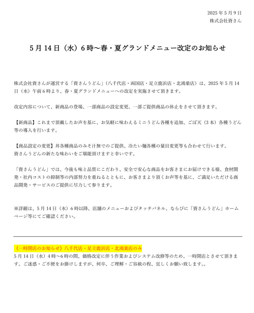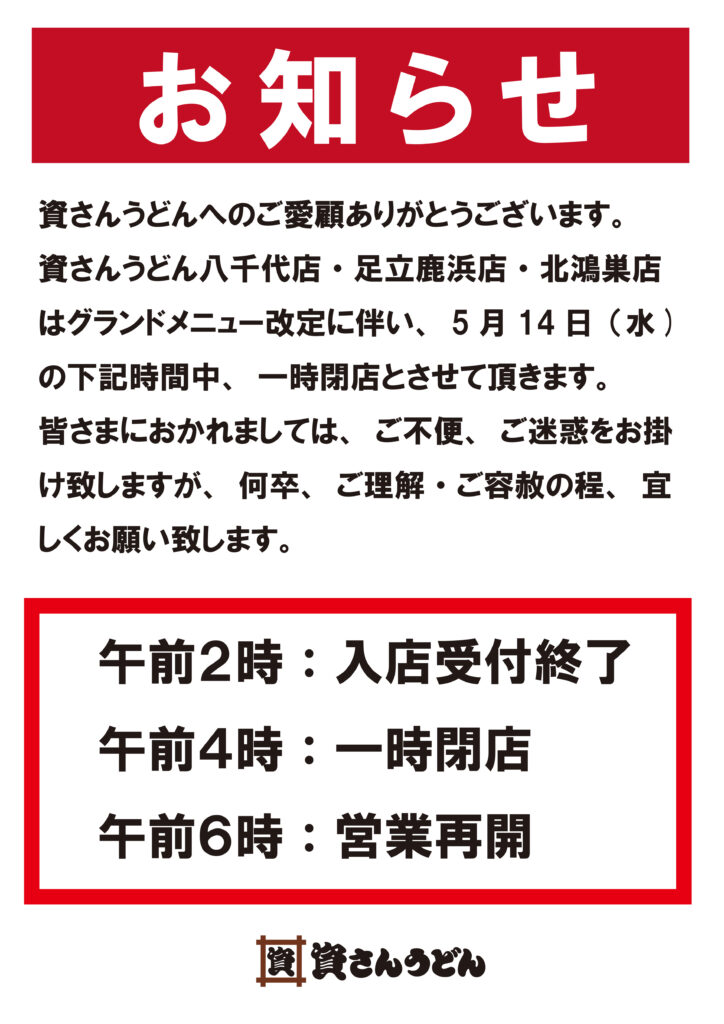 資さんうどんへのご愛顧ありがとうございます。資さんうどん八千代店・両国店・足立鹿浜店・北鴻巣店は5月14日(水)にグランドメニューの改定をさせて頂きます。また、5 月14 日(水)の下記時間中、一時閉店とさせて頂きます。