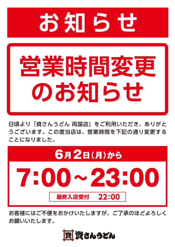 【営業時間変更】6/2(月)~両国店