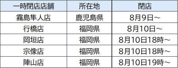 2025年08月10日 【一時閉店】8/10(日)18時時点 線状降水帯による大雨の影響を受け、下記店舗は、8月10日(日)現在、一時閉店とさせて頂いております。皆さまにおかれましては、ご不便をお掛けしますが、何卒、ご理解・ご容赦の程、宜しくお願い致します。