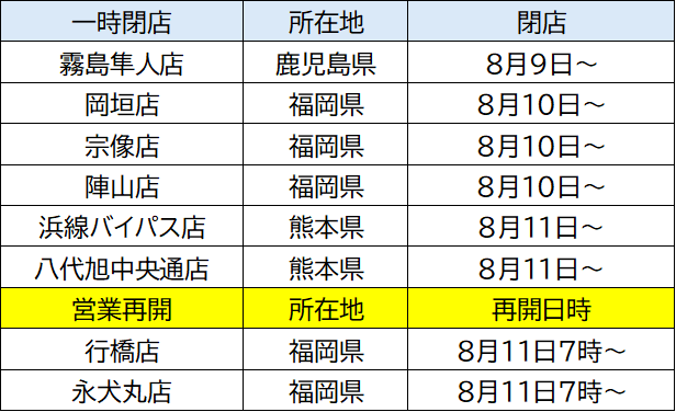 【一時閉店・営業再開】8/11(月)7時30分現在