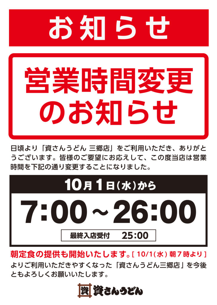 平素より資さんうどん三郷店をご愛顧頂き、誠にありがとうございます。