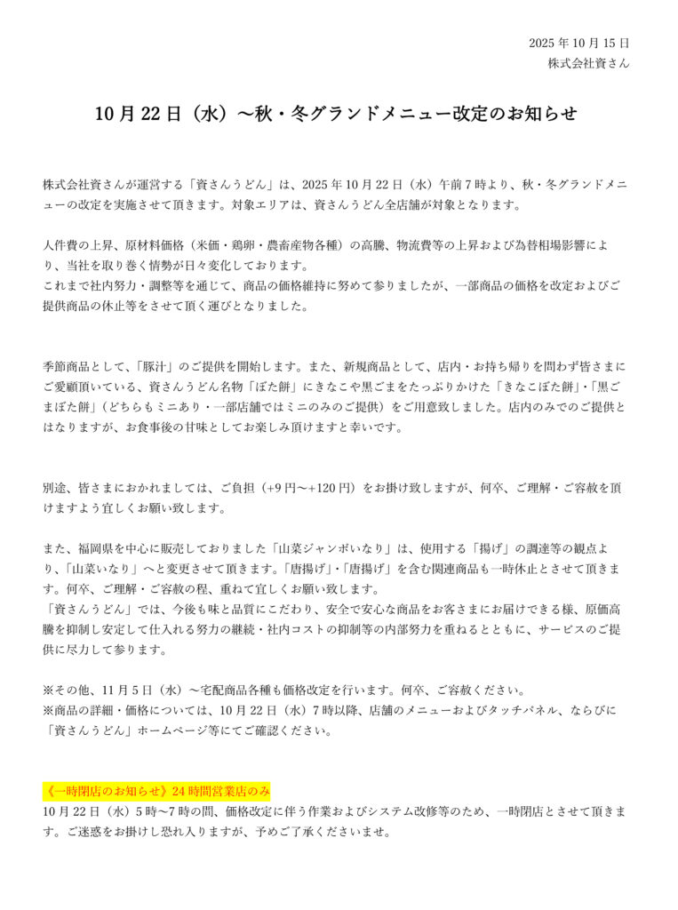 株式会社資さんが運営する「資さんうどん」は、2025年10月22日(水)午前7時より、秋・冬グランドメニューの改定を実施させて頂きます。対象エリアは、資さんうどん全店舗が対象となります。