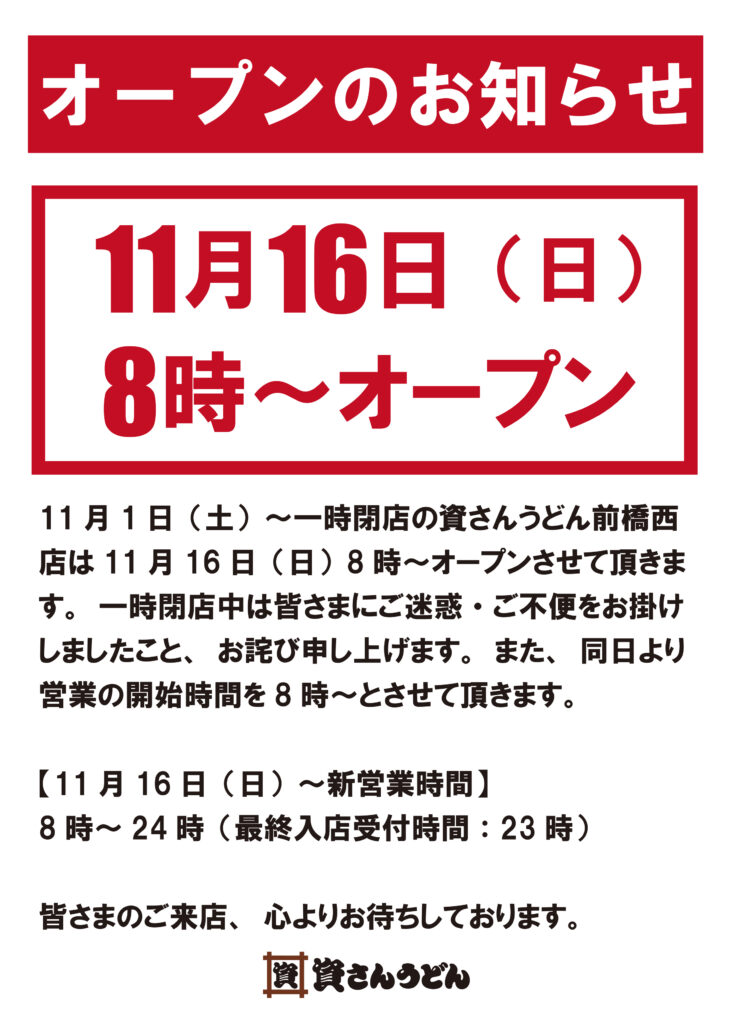11 月1 日(土) ~一時閉店の資さんうどん前橋西店は11 月16 日(日) 8 時~オープンさせて頂きま