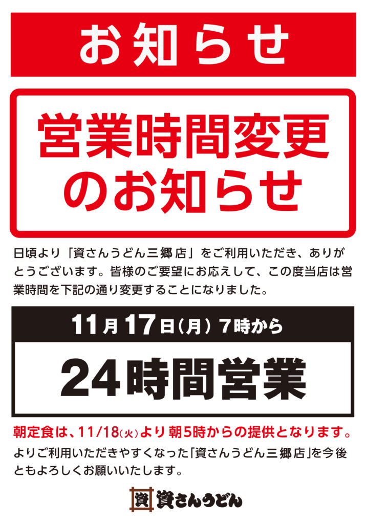 【営業時間変更】11/17(月)7時~三郷店