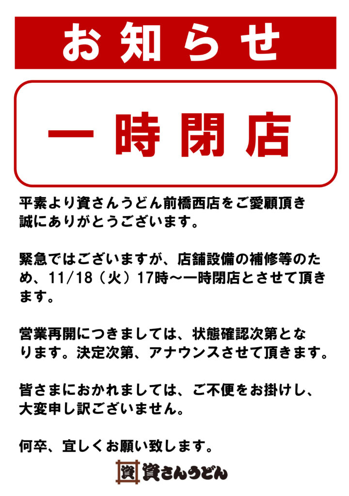 平素より資さんうどん前橋西店をご愛顧頂き誠にありがとうございます。