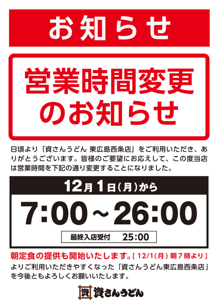 平素より資さんうどん東広島西条店をご愛顧頂き、誠にありがとうございます。