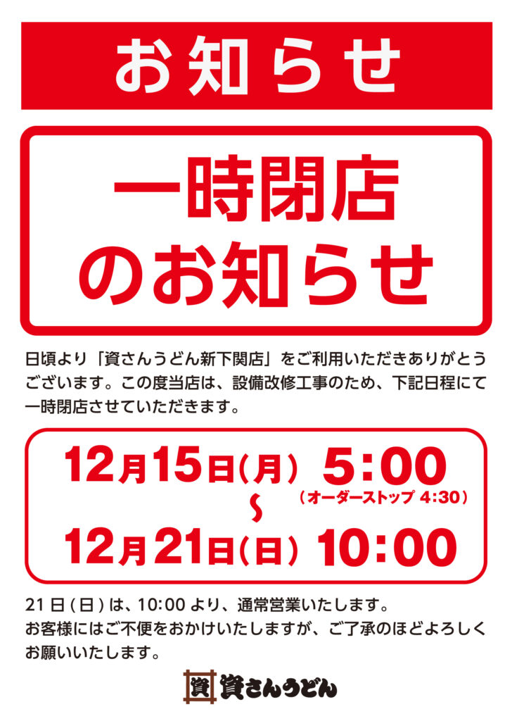 この度、設備改修工事のため、12/15(月)朝5時~一時閉店とさせて頂きます。