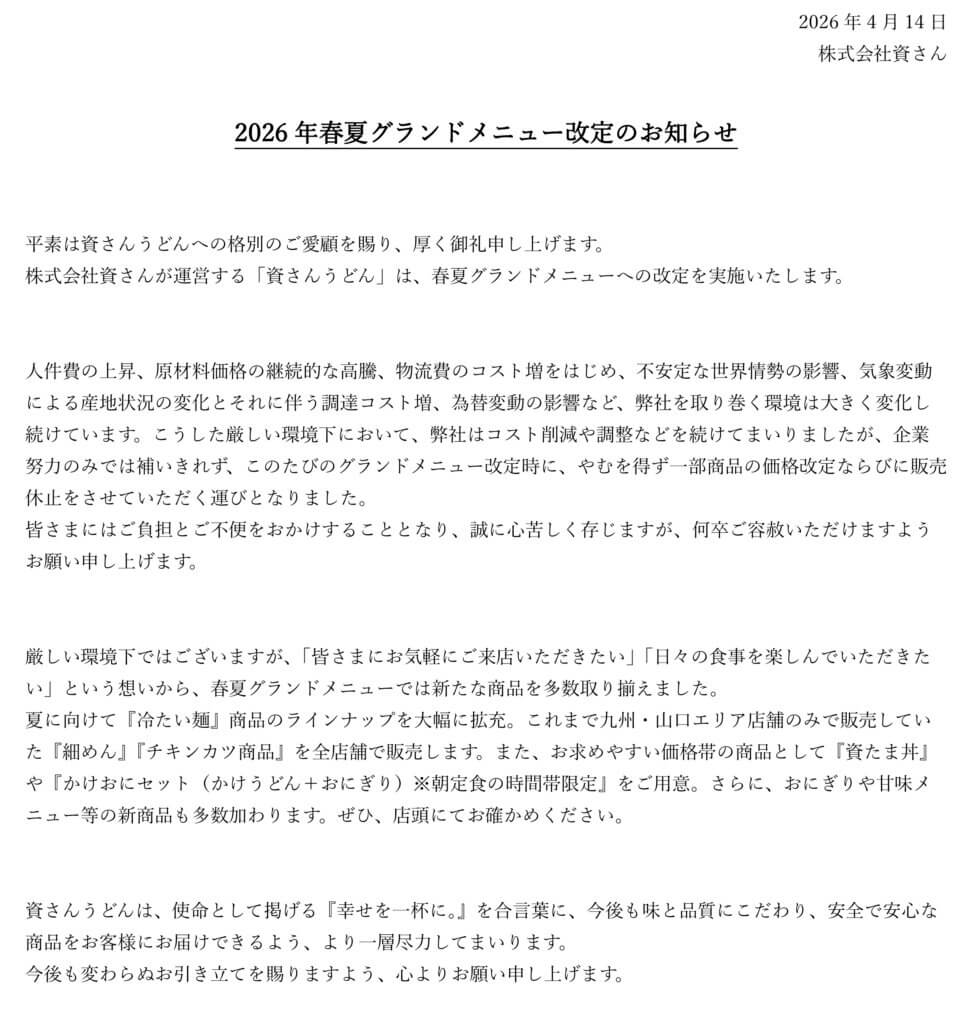 平素は資さんうどんへの格別のご愛顧を賜り、厚く御礼申し上げます。