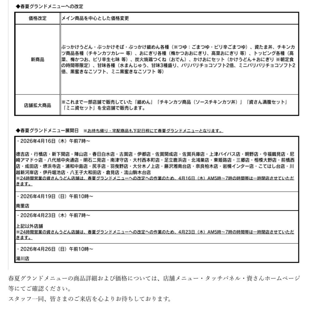 株式会社資さんが運営する「資さんうどん」は、春夏グランドメニューへの改定を実施いたします。