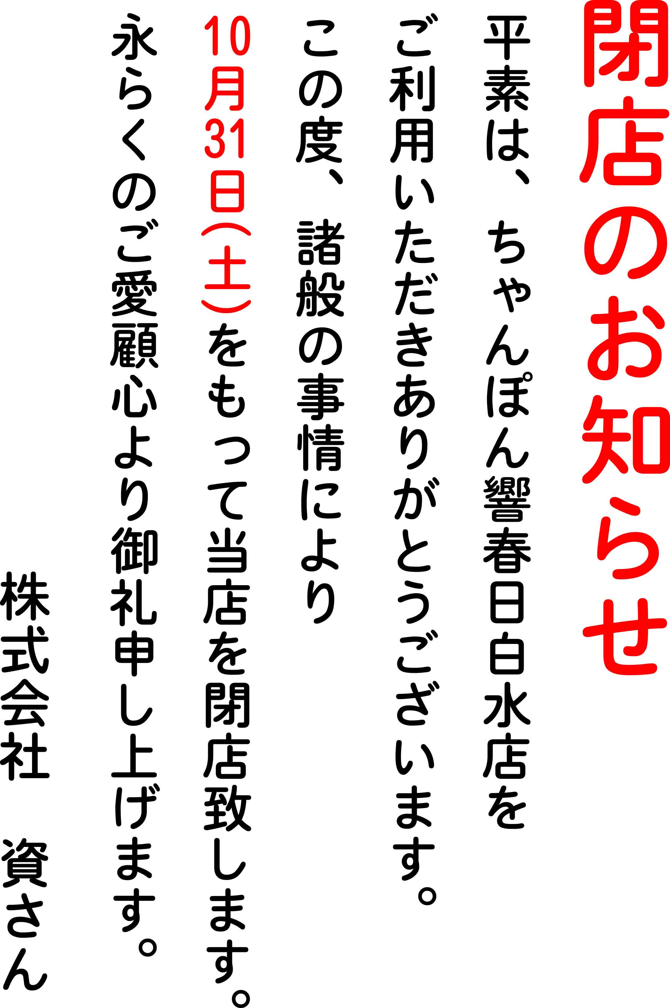 この度、諸般の事情により10月31日(土)午後11時をもって当店を閉店致します。