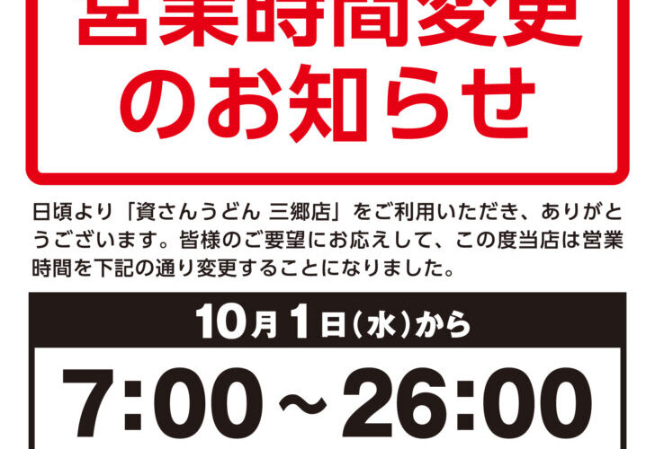 【営業時間変更】10/1(水)7時~三郷店