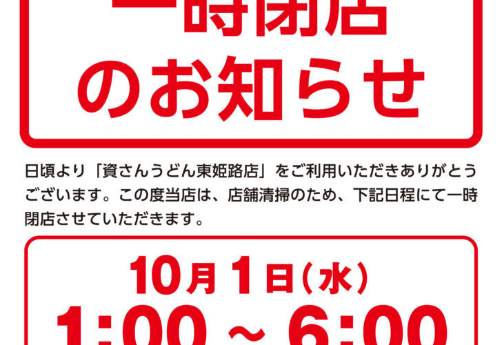 【一時閉店】10/1(水)午前1時~東姫路店