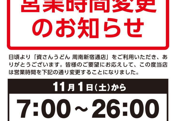 【営業時間変更】11/1(土)7時~周南新宿通店