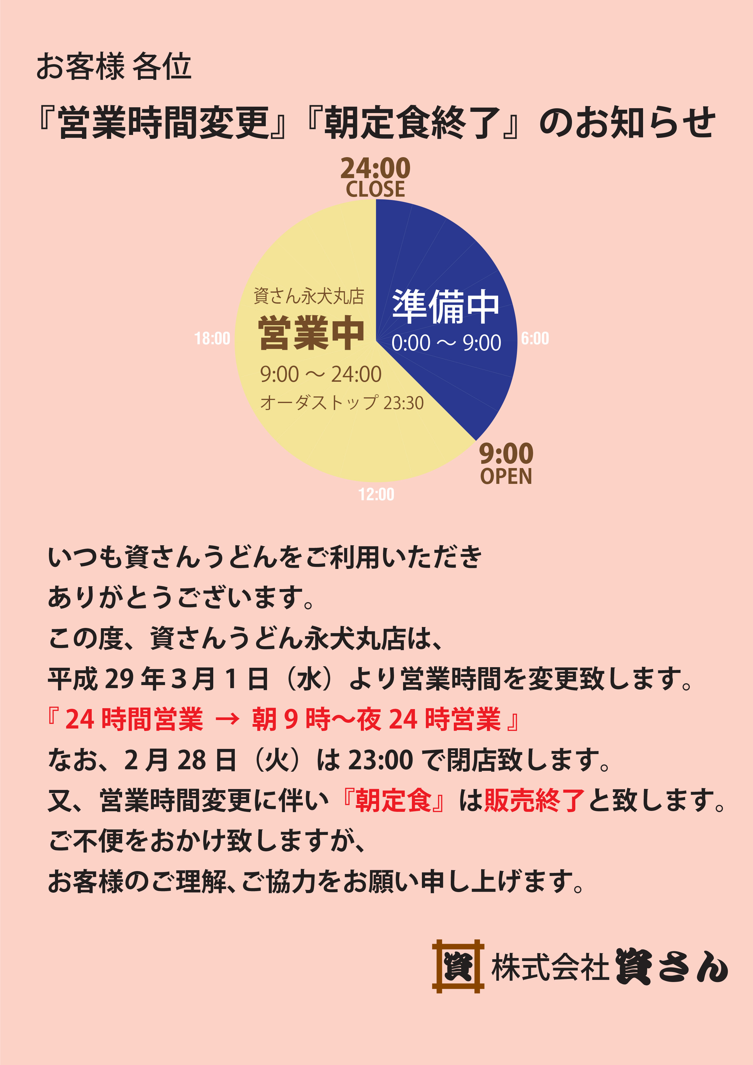 2017年02月21日 資さんうどん永犬丸店 営業時間変更のお知らせ 資さんうどん永犬丸店は、3月1日より深夜休業いたします。 午前9時~24時(深夜0時)の営業となります。 それに伴い、永犬丸店では朝定食の販売を終了いたします。 近隣の中間店、町上津役店は24時間営業ですので、朝定食はそちらの店舗をご利用ください。 なお、前日(2月28日)は諸々の変更作業のため、23時(午後11時)にて閉店させていただきます。 お客さまにはたいへんご不便をおかけいたしますが、何卒ご理解賜りますようお願い申し上げます。
