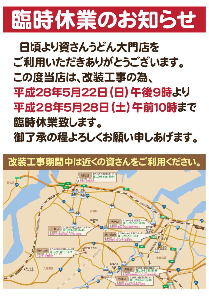 2016年05月11日 資さんうどん大門店改装工事のお知らせ 日ごろより資さんうどん大門店をご愛顧賜り 誠にありがとうございます。 大門店は改装工事のため、5月22日(日)21:00より5月28日(土)10:00まで臨時休業いたします。 ご迷惑をおかけいたしますがよろしくお願いいたします。